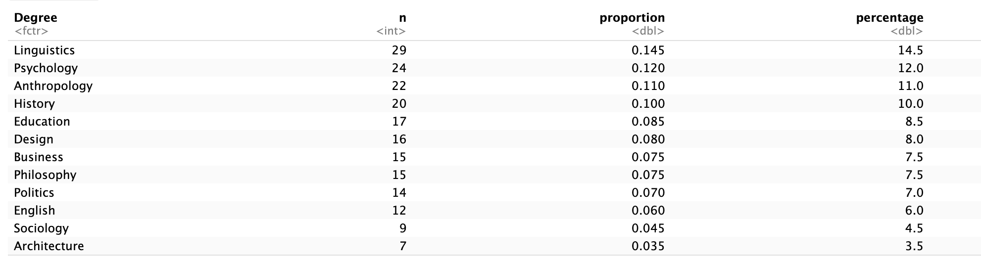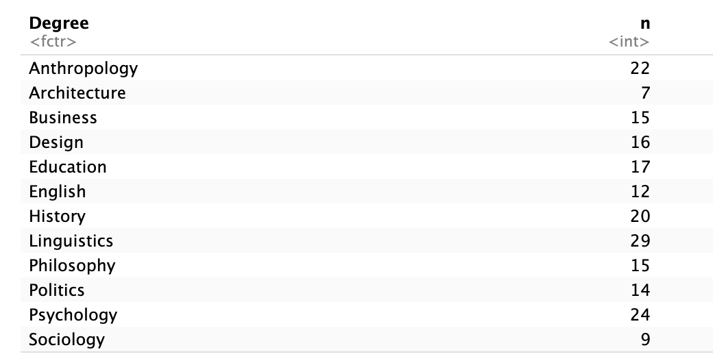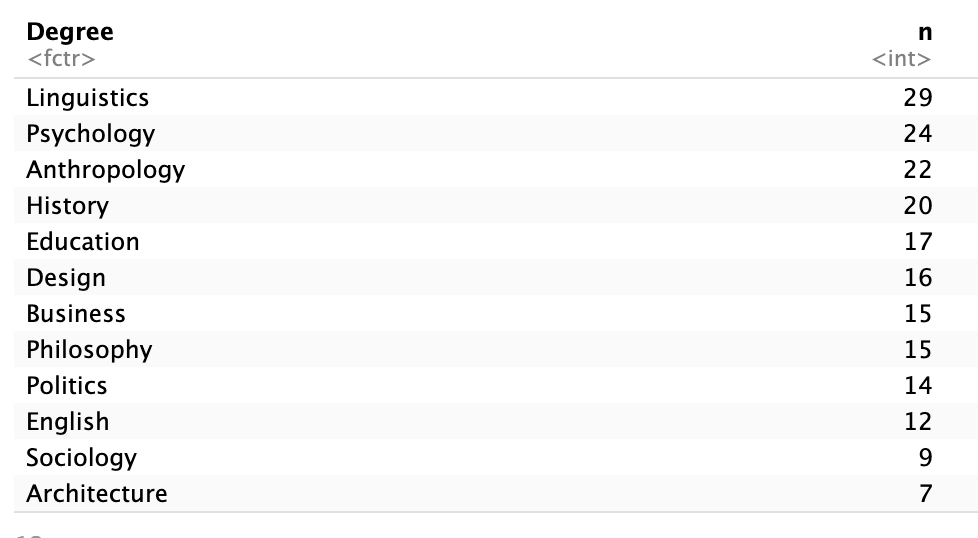 students$Degree [1] "Architecture" "Linguistics" "English" "Philosophy" "Linguistics"