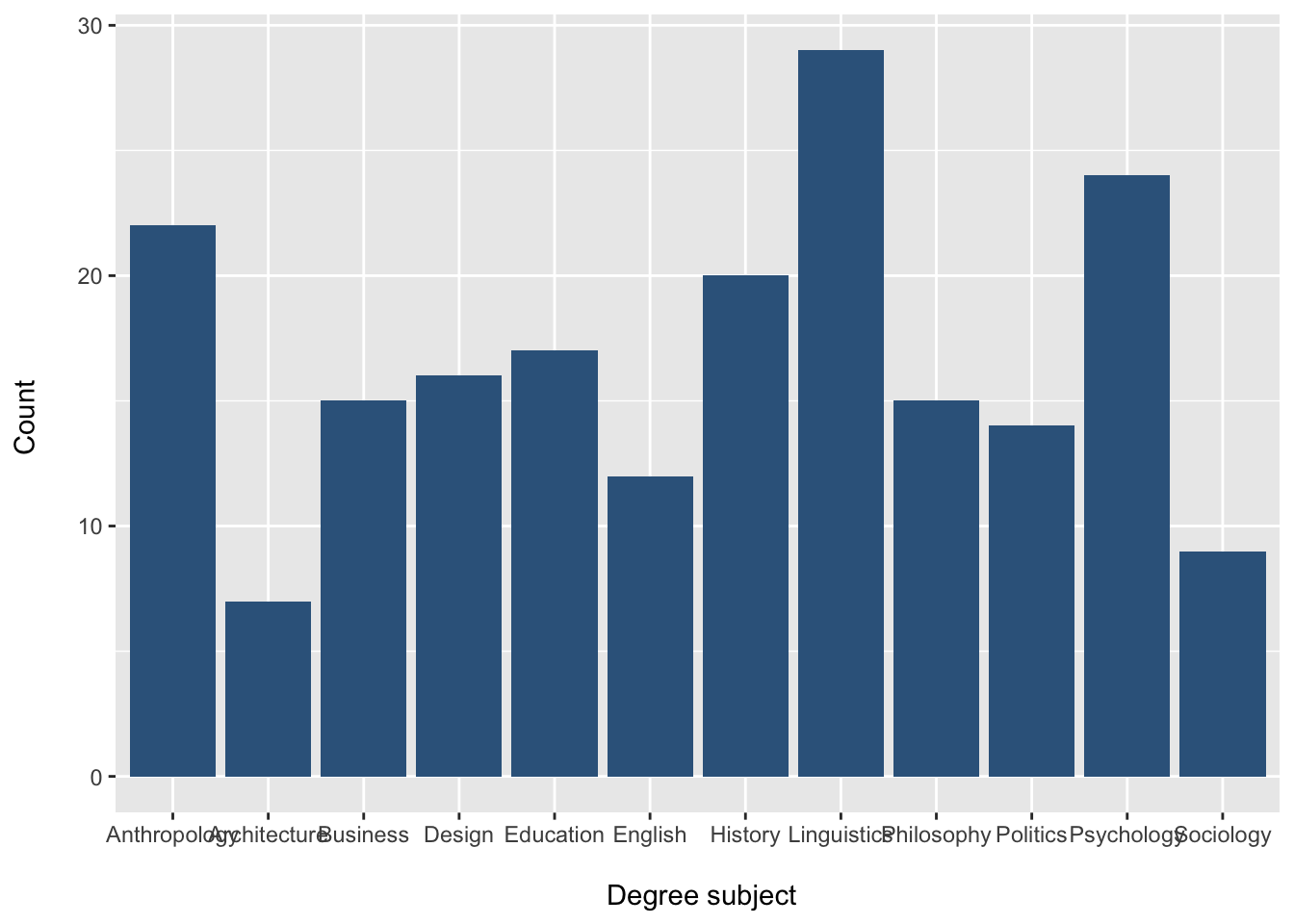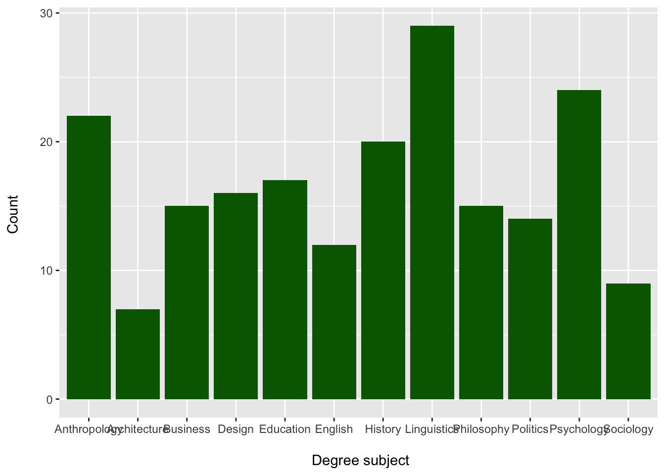 [31] "Anthropology" "Psychology" "Psychology" "Architecture" "Psychology"