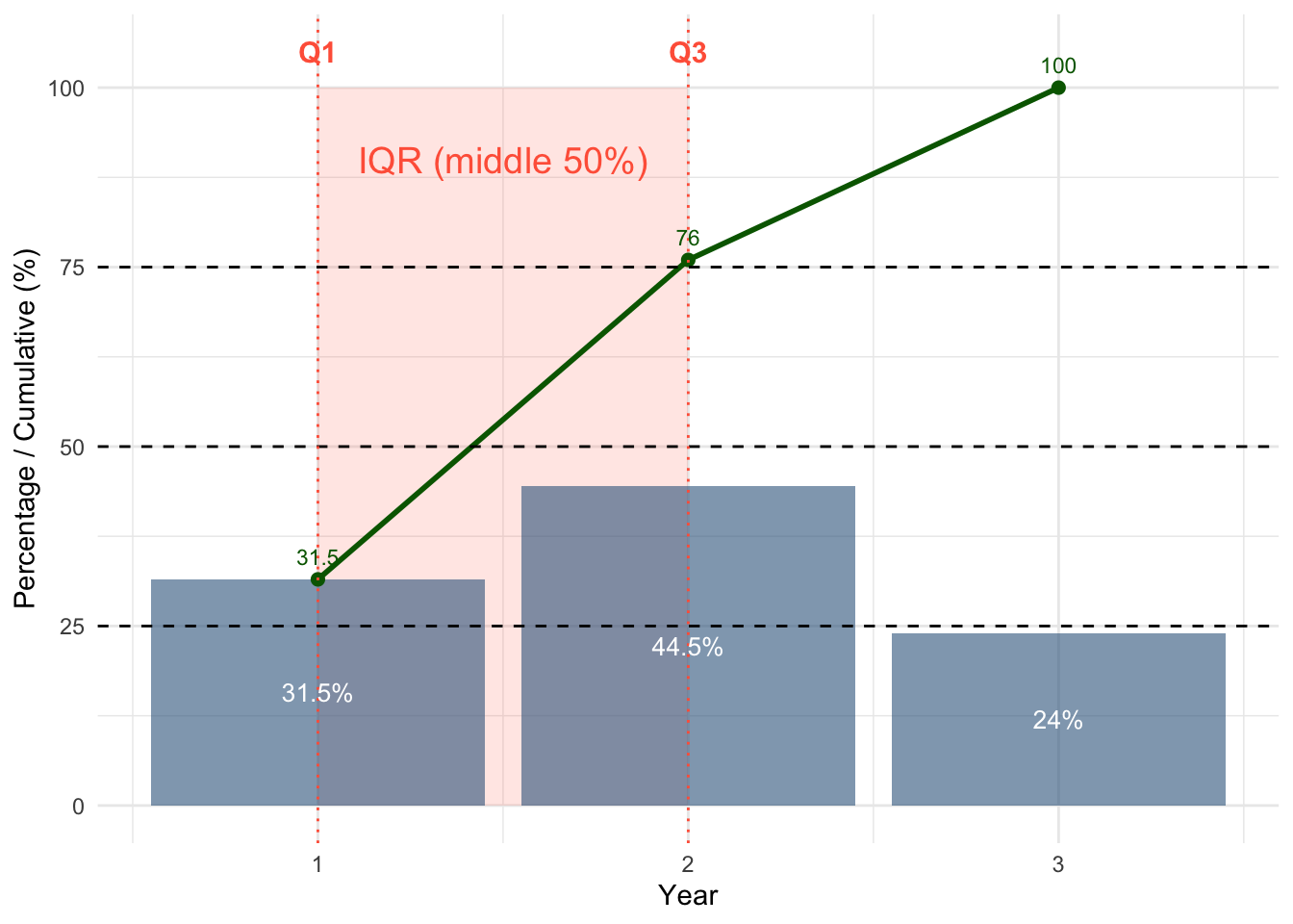 - Quartiles are based on cumulative percentages