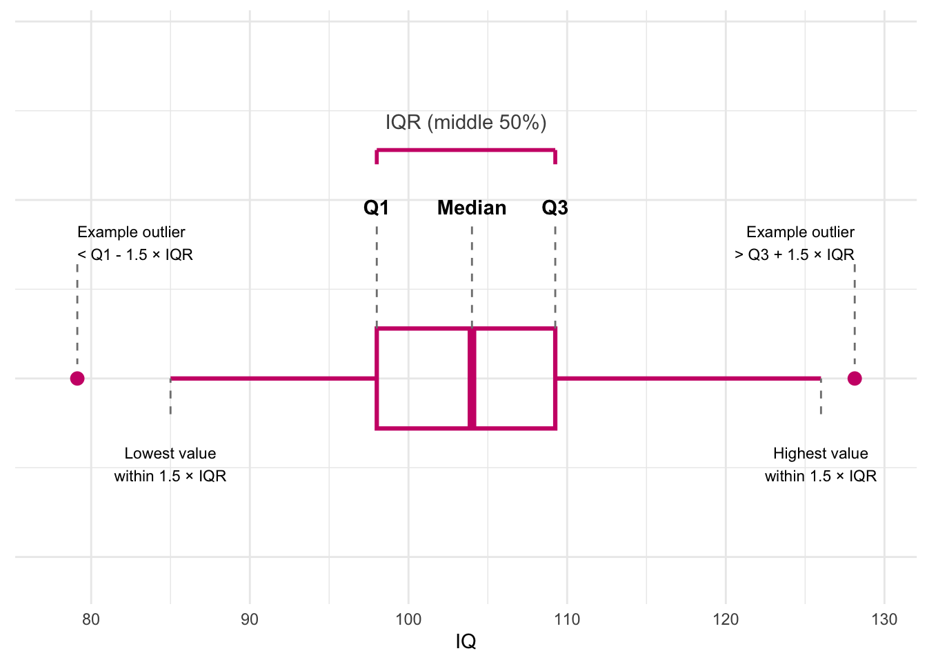 - IQR measures the spread of the middle 50%