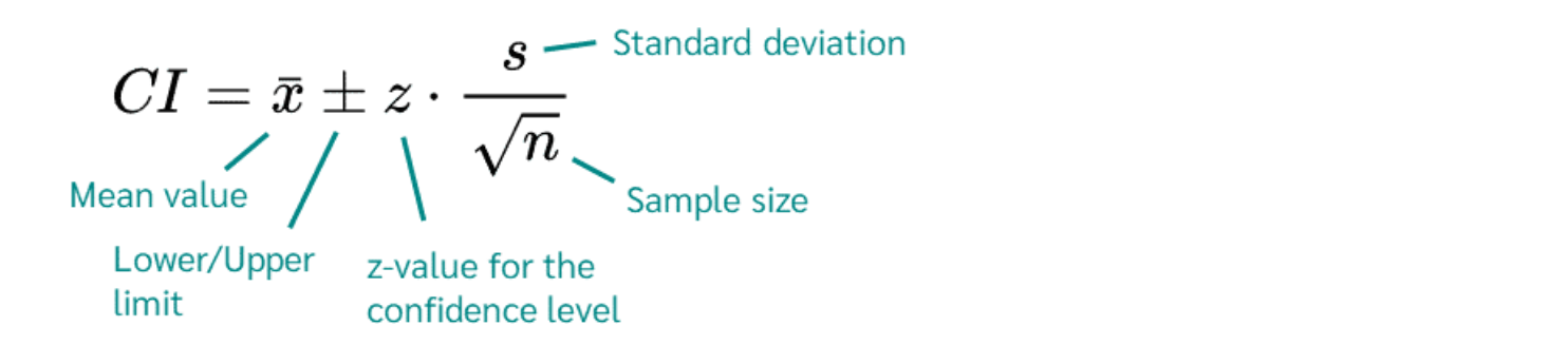 \[ CI = \bar{x} \pm t \times \frac{s}{\sqrt{n}} \]