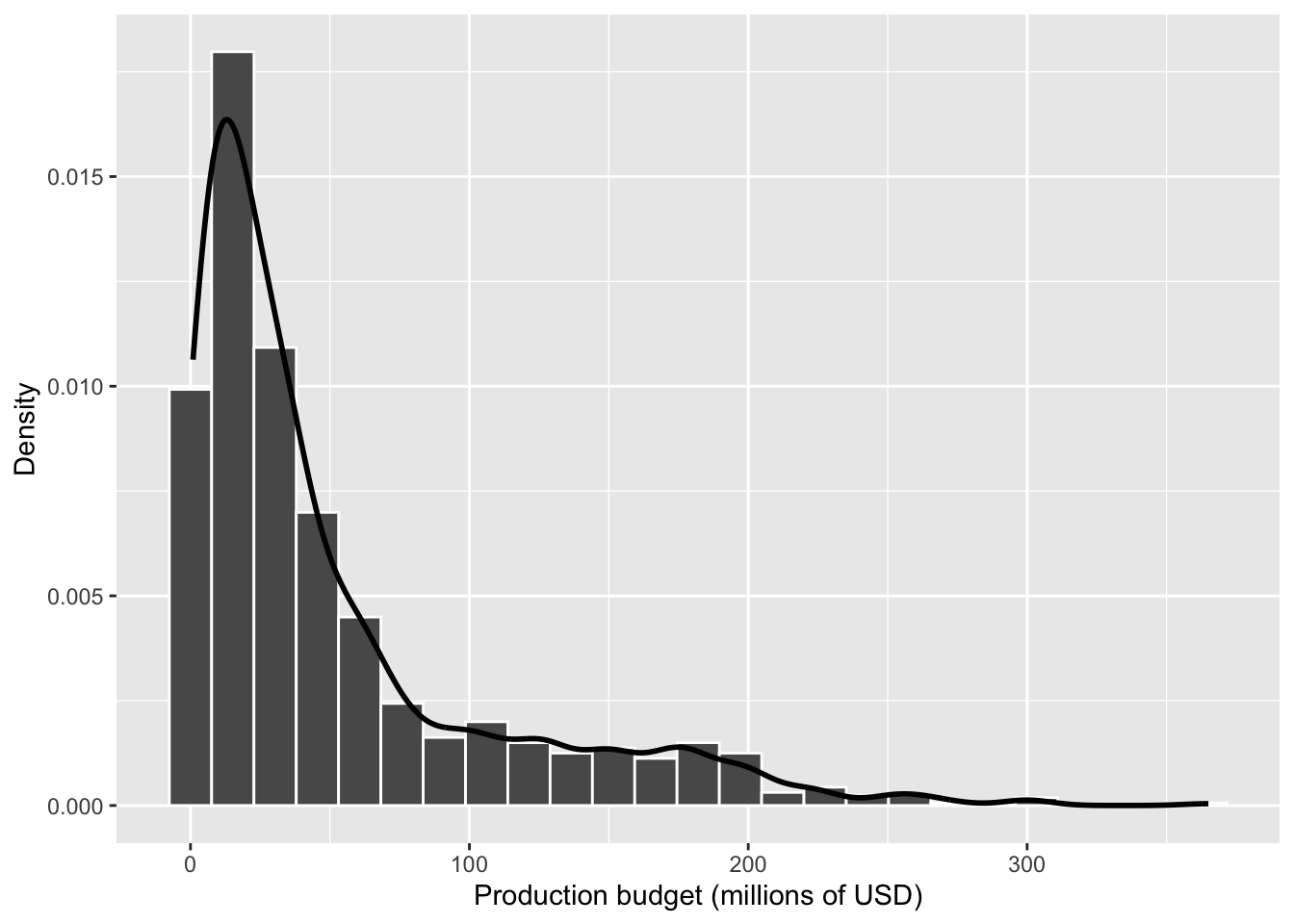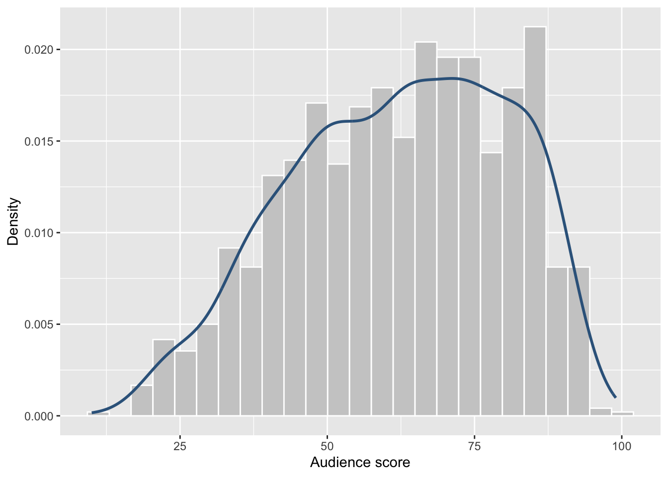 Taken together, the histogram, density plot, and numerical summaries show that audience ratings are generally moderate to high, with relatively few extremely low scores.