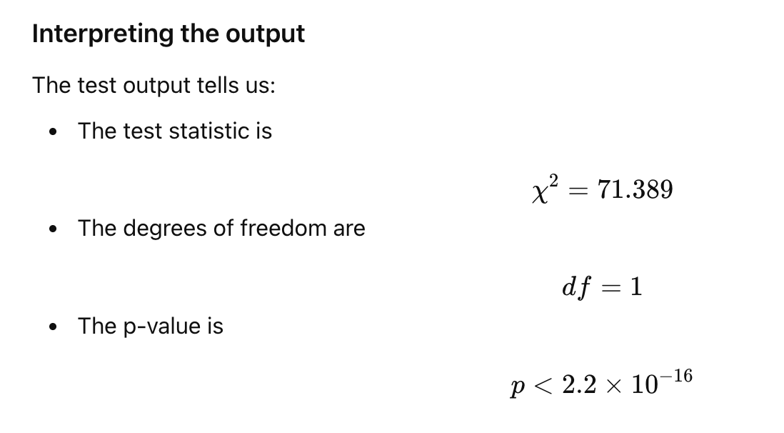 X-squared = 71.389, df = 1, p-value < 2.2e-16