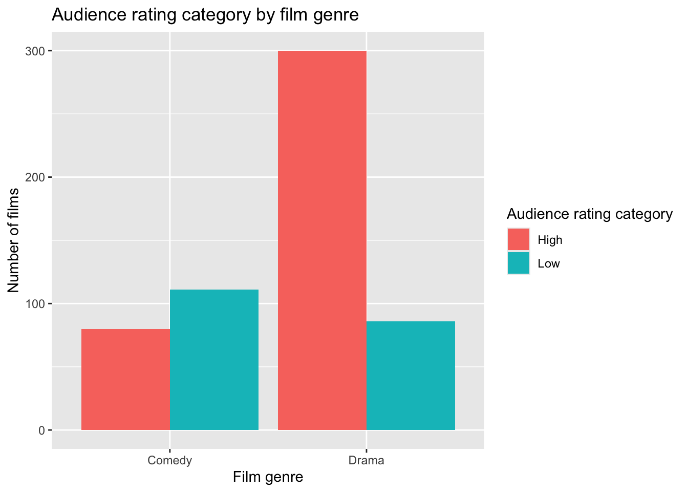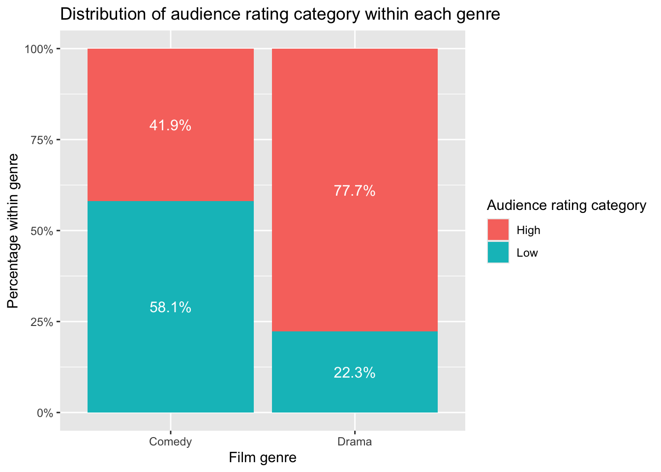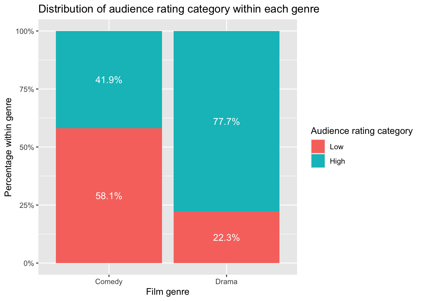 Inspection of the contingency table and the percentage bar plot suggested that the distribution of audience rating categories differs between Comedy and Drama films. In particular, a much larger proportion of Drama films were rated “High” compared with Comedy films.